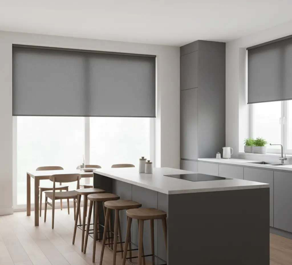 As persianas de rolo são práticas, modernas e funcionais. Quando fabricadas com tecido blackout lavável, tornam-se uma excelente opção para cozinhas americanas, já que podem ser limpas facilmente com pano úmido. Além disso, seu design clean combina perfeitamente com ambientes integrados, permitindo controlar a luminosidade de forma simples e eficiente.